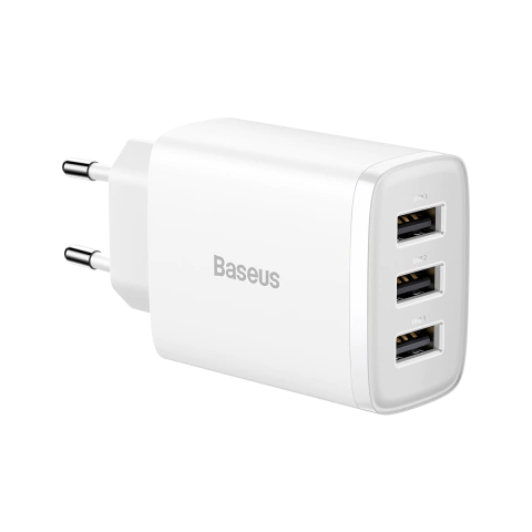Carregador de parede compacto com 3 portas USB para recarregar até três dispositivos simultaneamente. Ideal para smartphones, tablets e acessórios, com design premium e certificação Anatel.