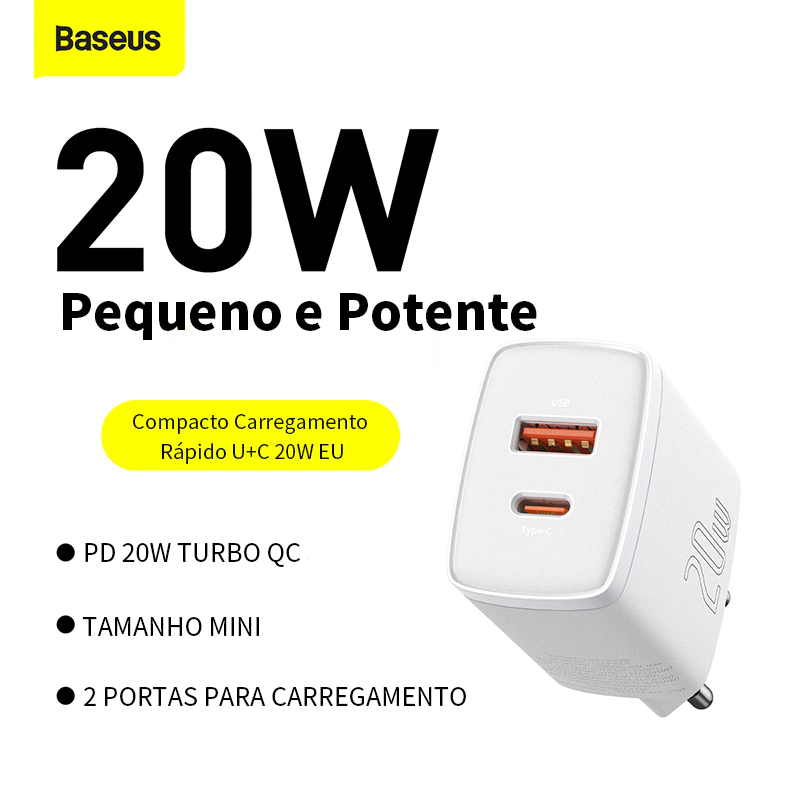 Carregador Turbo 20W com USB-A e Tipo-C, suporte a PD e QC 3.0, compatível com iPhone e Android. Leve, compacto e seguro para uso diário.