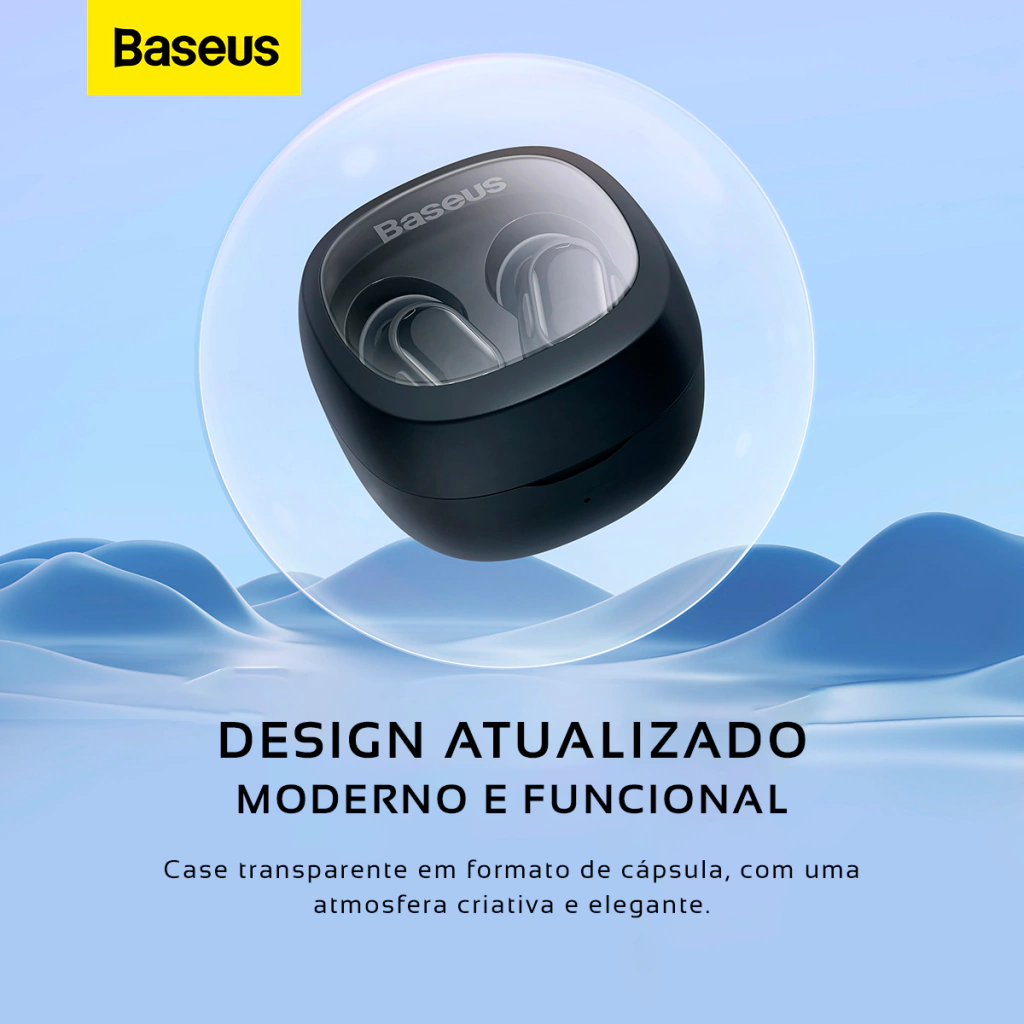 Fones TWS compactos com Bluetooth 5.3, som potente e até 25h de autonomia com o estojo. Comandos por toque, app exclusivo Baseus e design ergonômico para o dia a dia.