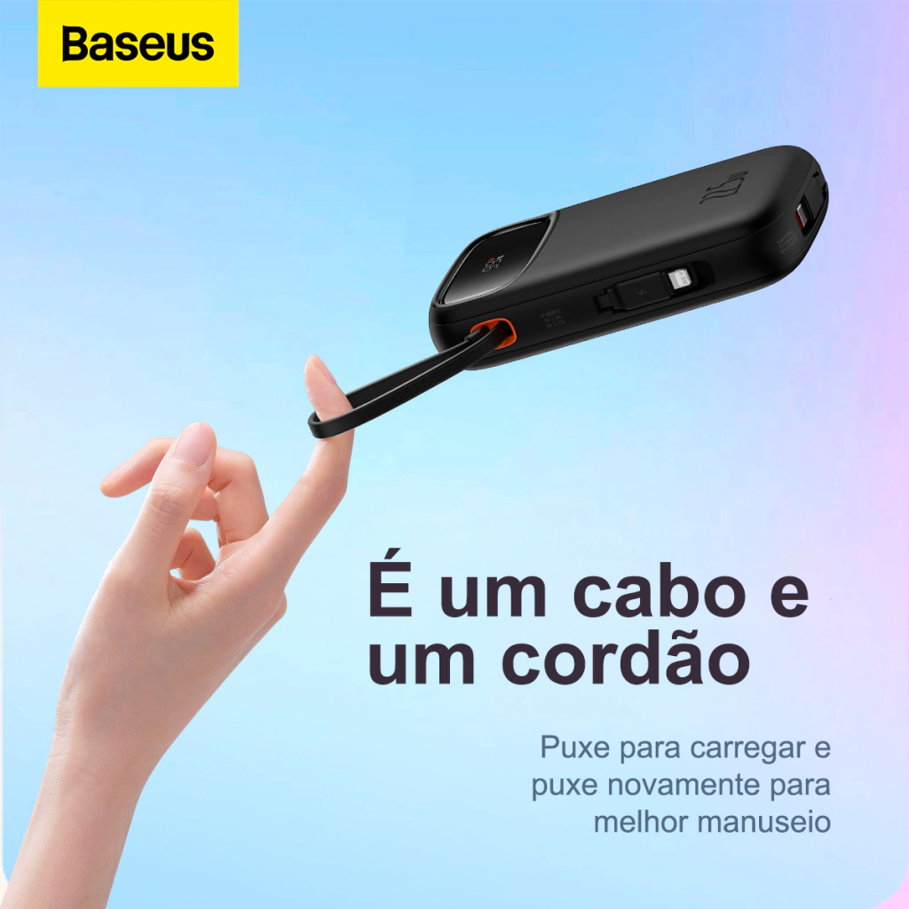 Com 20000mAh de capacidade, este power bank é perfeito para quem precisa de energia durante todo o dia. Possui suporte a carregamento rápido até 22.5W via USB-C, além de incluir dois cabos acoplados (USB-C e Lightning), evitando a necessidade de carregá-los separadamente. O display digital oferece controle total do nível de energia restante. Compacto e eficiente, é ideal para viagens ou uso diário.