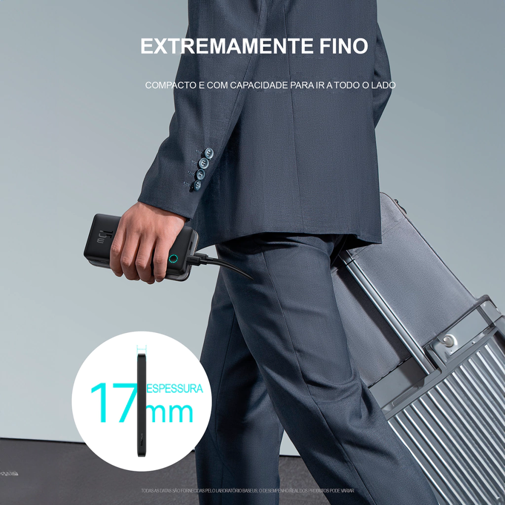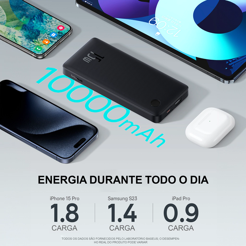 Power Bank compacto com 10000mAh e carregamento rápido de 15W. Acompanha cabo USB-C de 30cm, ideal para uso no dia a dia com smartphones, tablets e mais.