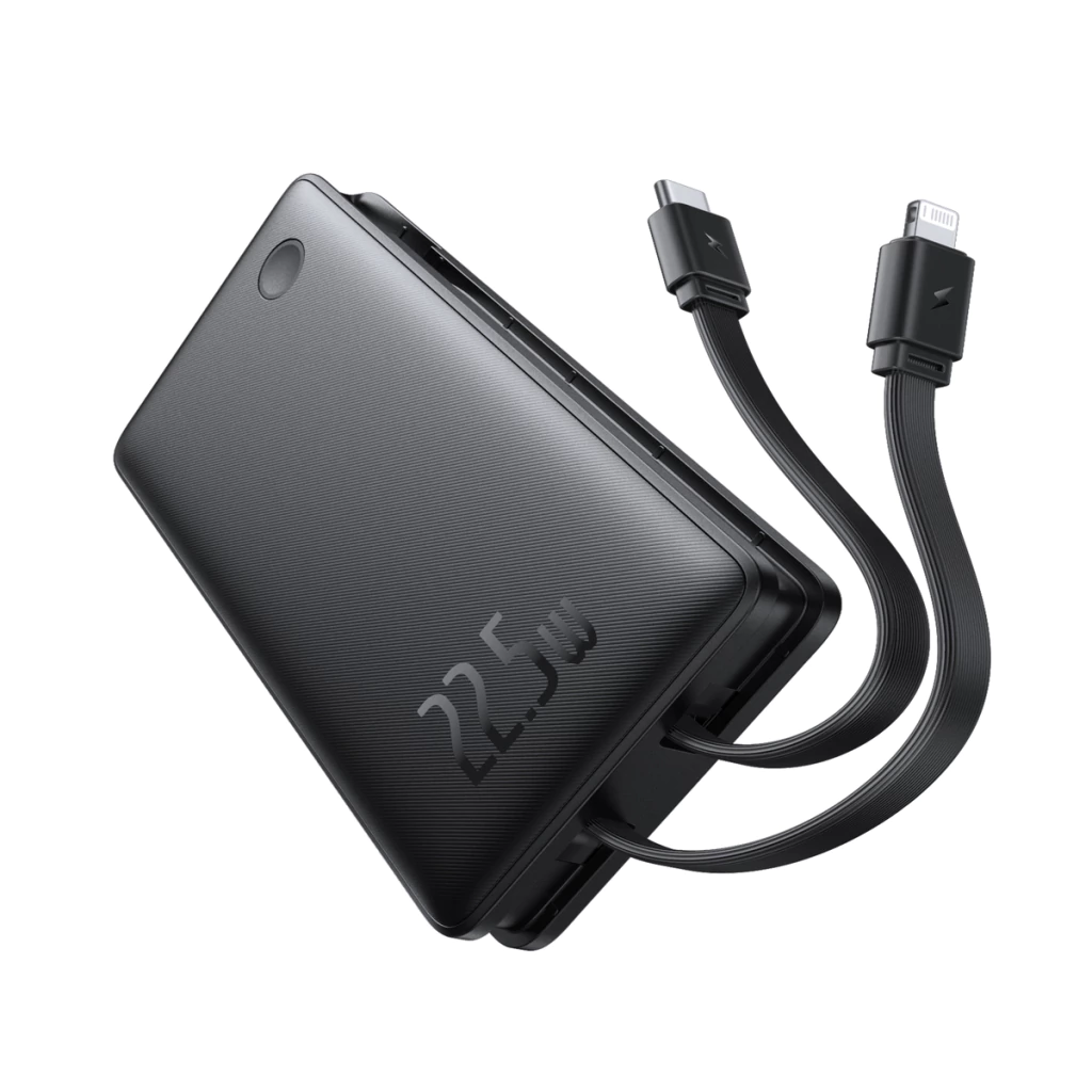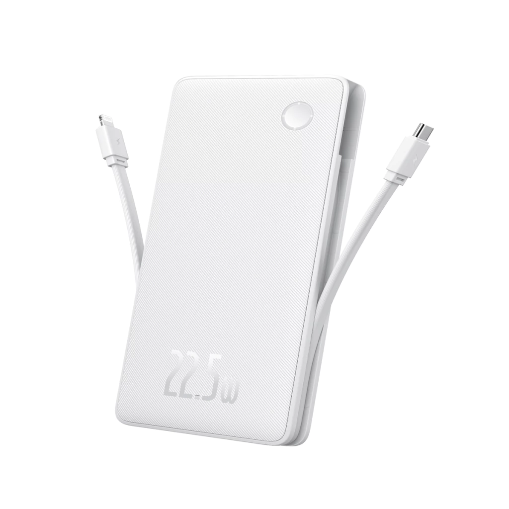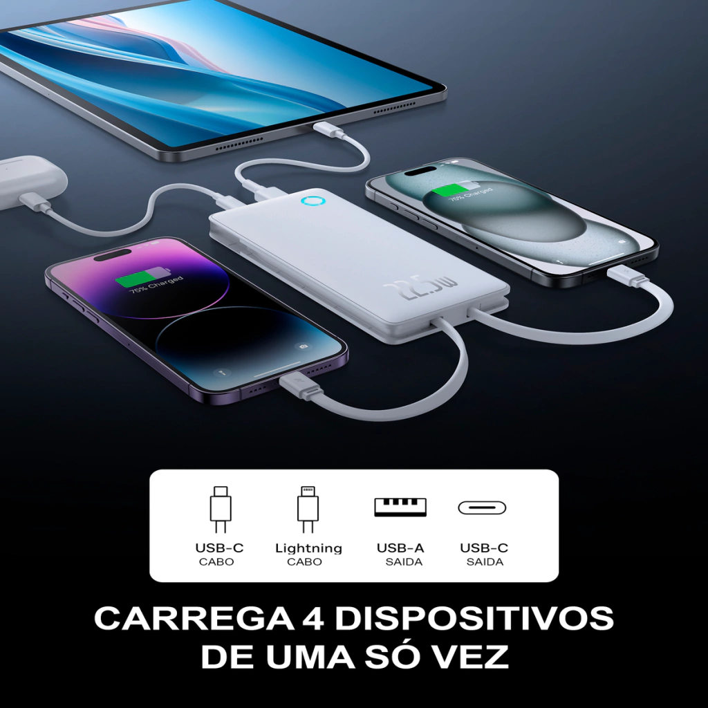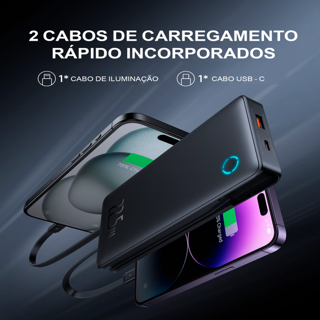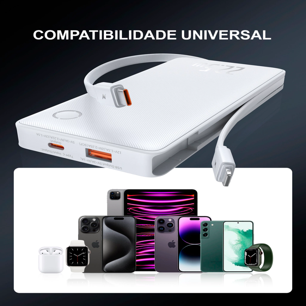 Power Bank compacto com 10000mAh e cabos integrados Lightning + USB-C. Carregamento rápido de até 22.5W, compatível com Android, iPhone e diversos dispositivos.