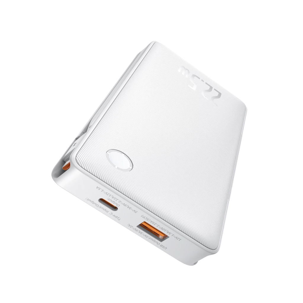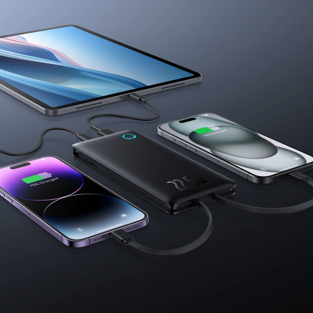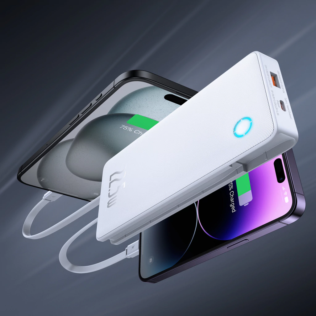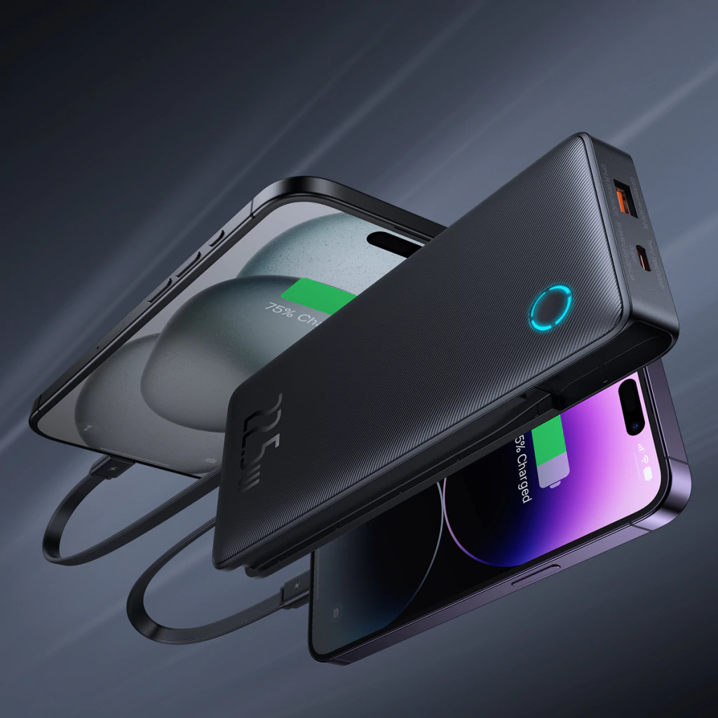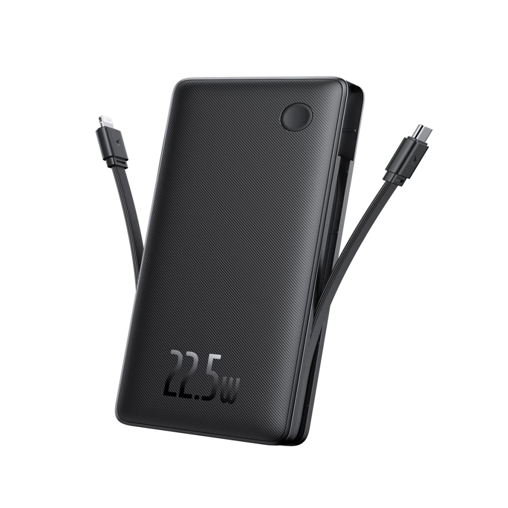 Power Bank compacto com 10000mAh e cabos integrados Lightning + USB-C. Carregamento rápido de até 22.5W, compatível com Android, iPhone e diversos dispositivos.