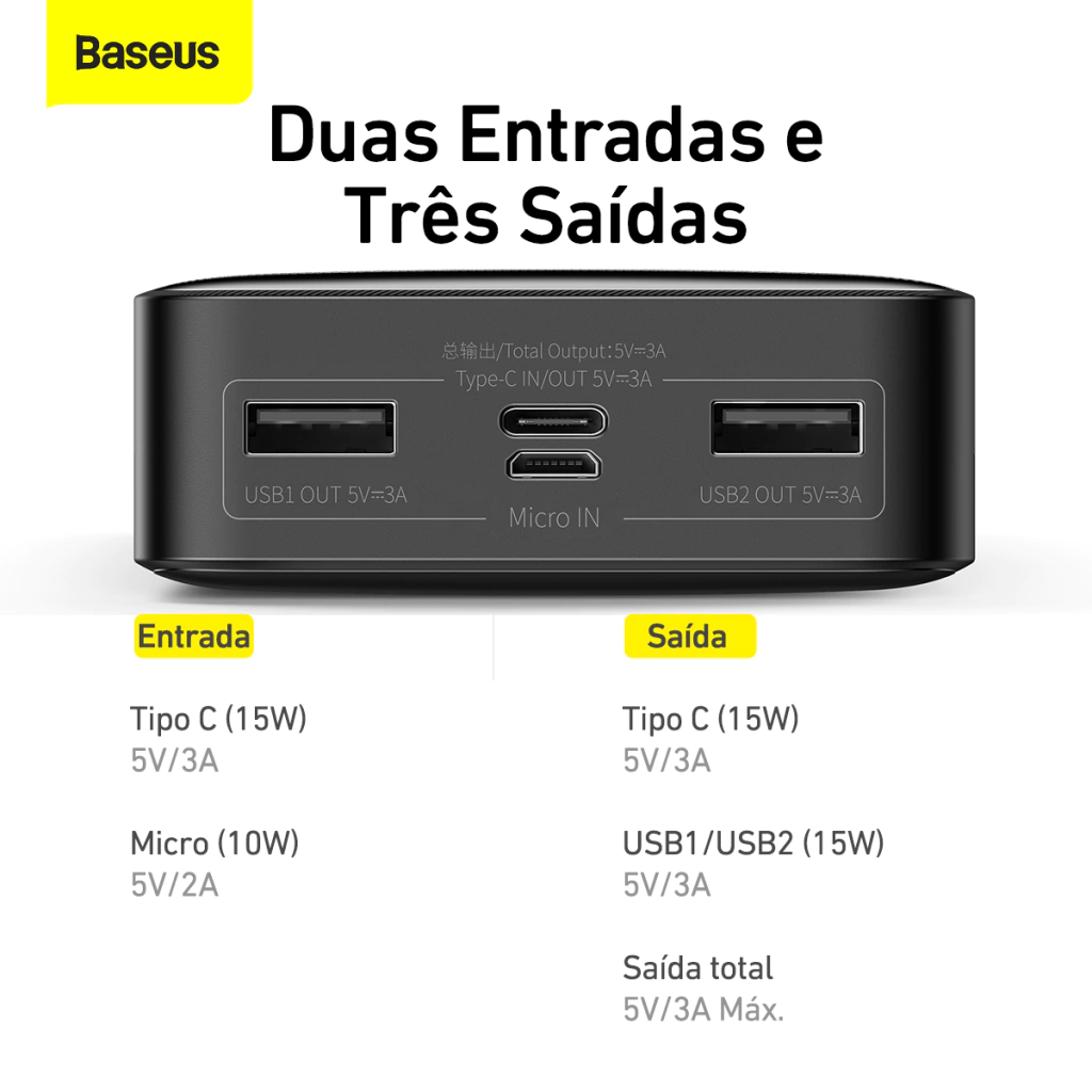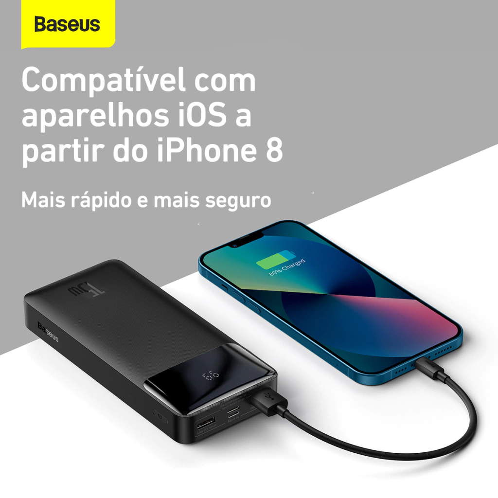 Capacidade de 20000mAh com até 15W de saída para carregamento rápido