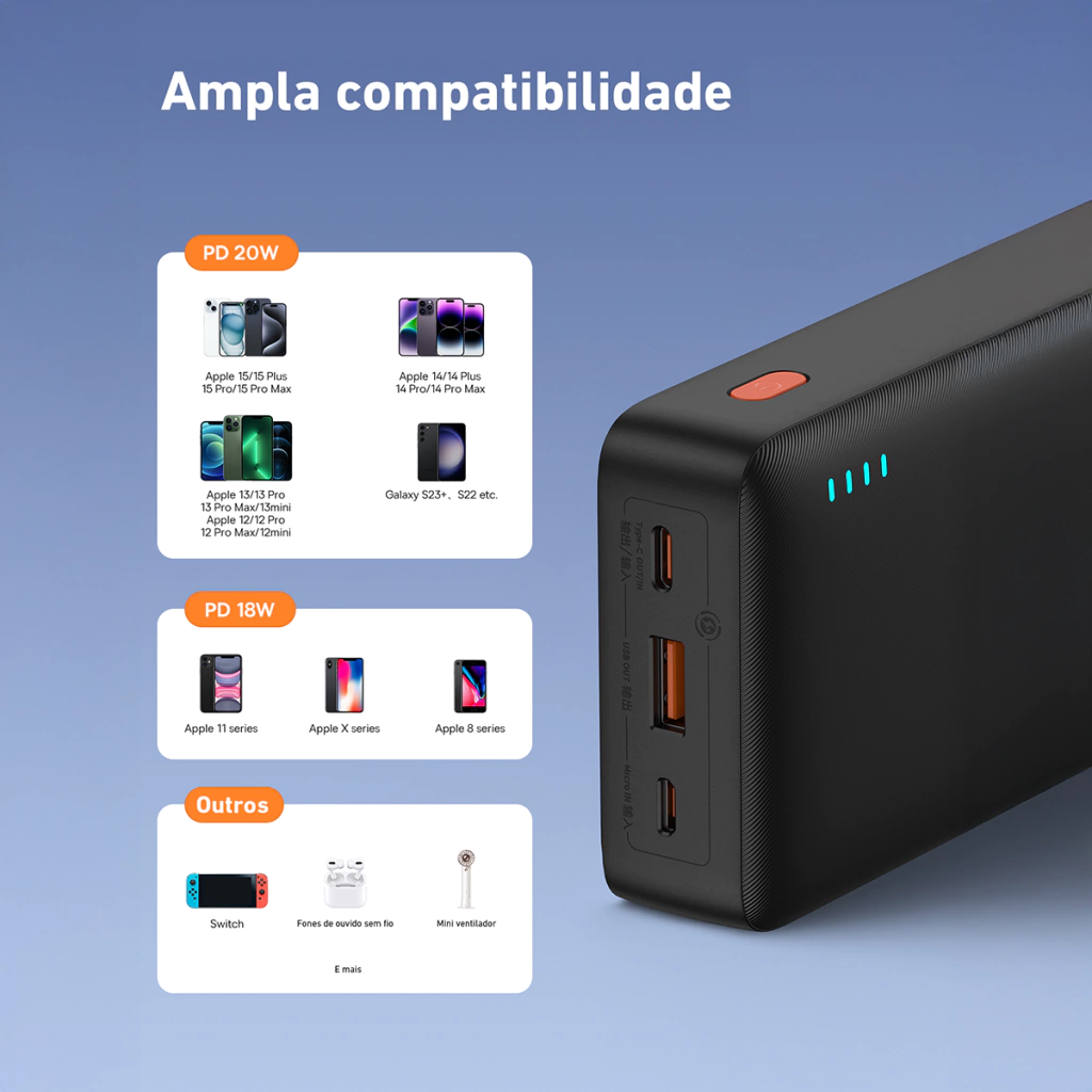 Carga rápida de 20W e grande capacidade de 20000mAh.