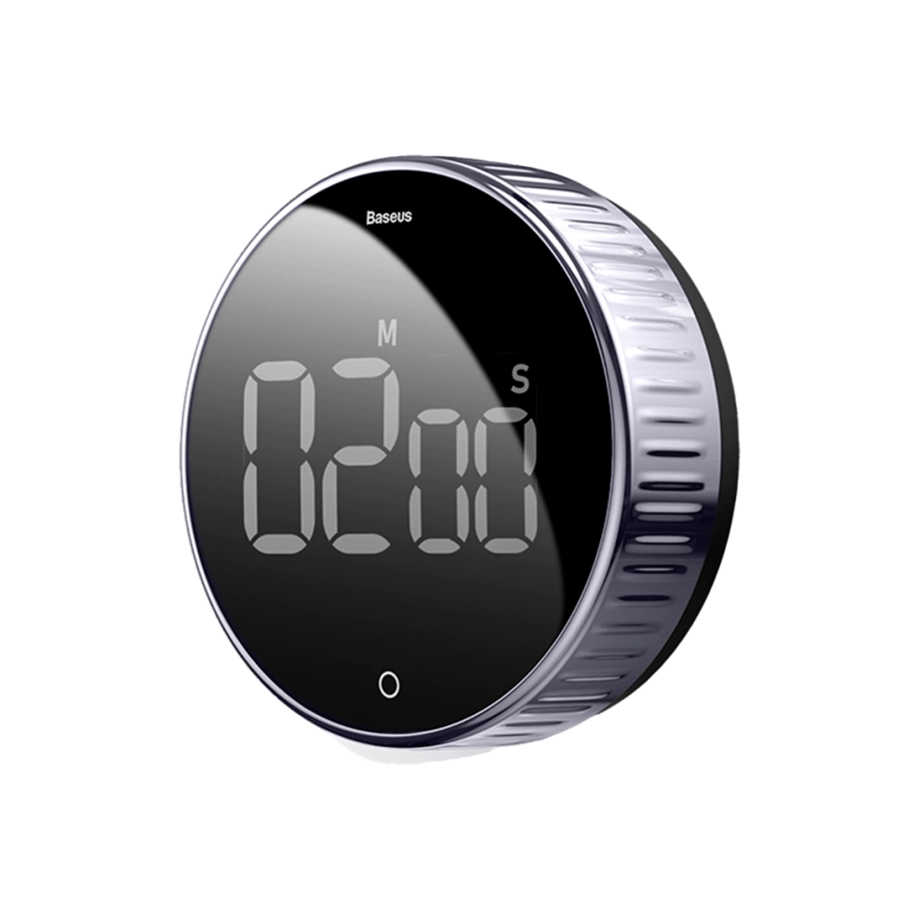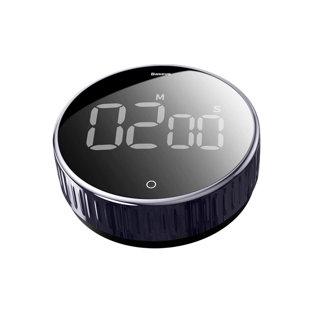Timer digital magnético com design rotatório intuitivo, ideal para cozinhar, estudar ou treinar. Possui display LED de alta visibilidade, volume ajustável e função regressiva ou progressiva.